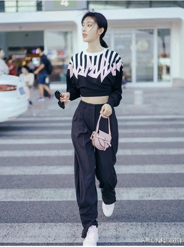 西裝褲真的是太實用了,短款的上衣搭配西裝褲和小白鞋,這套穿搭讓張儷輕鬆穿出了超模的感覺。