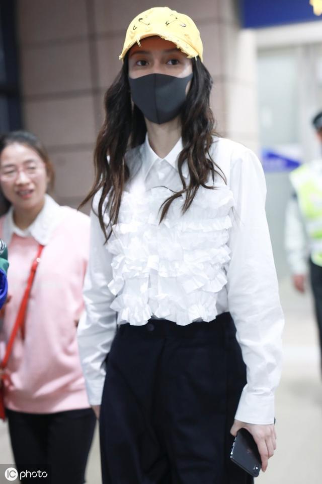 Angelababy一身洒脫職場裝走機場,小黃帽吸睛