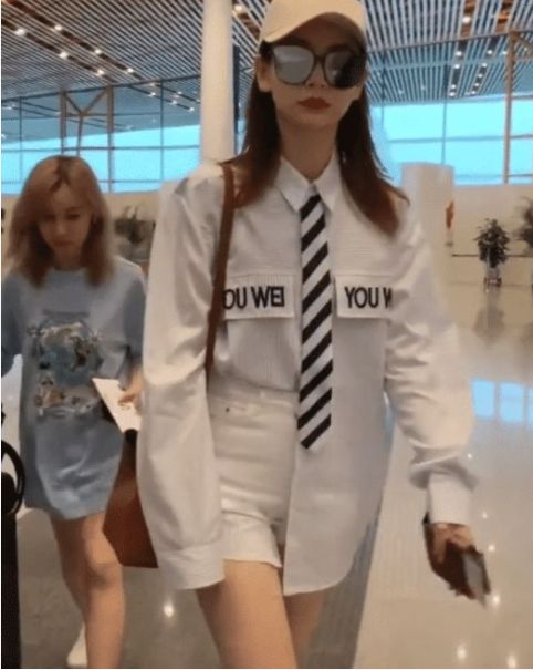 在最近的一場機場街拍中。她身穿白色襯衫,白色短褲,戴着白色帽子。臉上掛着一副黑色墨鏡,非常有氣場。但是網友卻有點疑惑。大家都在研究她的短褲是怎麼穿上去的呢?因為這條短褲造型比較奇特。其實這是一種非常時尚的穿法,就是在穿短褲時把襯衫的一邊塞進去短褲里,另一邊不塞。是一種“下衣失蹤”的穿法。這種穿法可以顯得比例好,腿長。